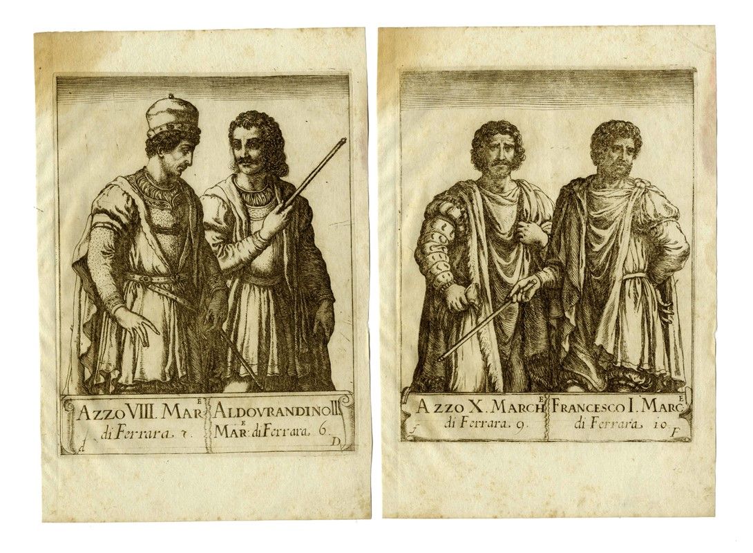 Acquaforte. mm 180/184x141.Foglio: mm 230x160. Bartsch, XX,11-23. TIB,44, pp. 351-363. Dodici tavole dall'opera riccamente illustrata sulla storia degli Este, signori di Ferrara. Dedicata al duca di Modena, è corredata nella sua veste completa da frontespizio e 13 incisioni ciascuna raffigurante due principi di Ferrara, accompagnate da sezioni biografiche scritte dallo storico Antonio Cariola. Nella prefazione, l'incisore ed editore Caterino Doino spiega che questo lavoro celebrativo fu intrapreso in età avanzata. L'autore trasse ispirazione dall'opera di Francesco Berni, Degli eroi della serenissima casa d'Este, ch'ebbero il dominio in Ferrara : memorie di Francesco Berni, In Ferrara: Per Francesco Suzzi stampator camerale,1640, illustrata con cinque ritratti (Almerico, Tedaldo I, Bonifacio III, Matilde e Azzo VIII). A questi Doino aggiunse, nei suoi Ritratti, Guglielmo Adelardi, Marchesella Adelardi, Aldovrandino II, Azzo IX, Obizzo IV, Azzo X, Francesco I, Azzo XI, Rinaldo III, Obizzo VII, Aldovrandino IV, Niccolò Zoppo II, Alberto V, Niccolò III, Lionello I, Borso I, Ercole I, Alfonso I, Ercole II, Alfonso II e Cesare I. Le tavole sono considerate una seconda edizione delle illustrazioni de' prencipi d'Este (1640) dello stesso Doino, una serie di stampe, che differiscono solo per la numerazione rivista, e prive del testo storico. Una proposta attributiva per la realizzazione delle acqueforti a Giuseppe Caletti sembra non essere più accolta ad oggi. Tutti i ritratti sono vagamente basati sugli affreschi di Faccini nel Castello di Ferrara.