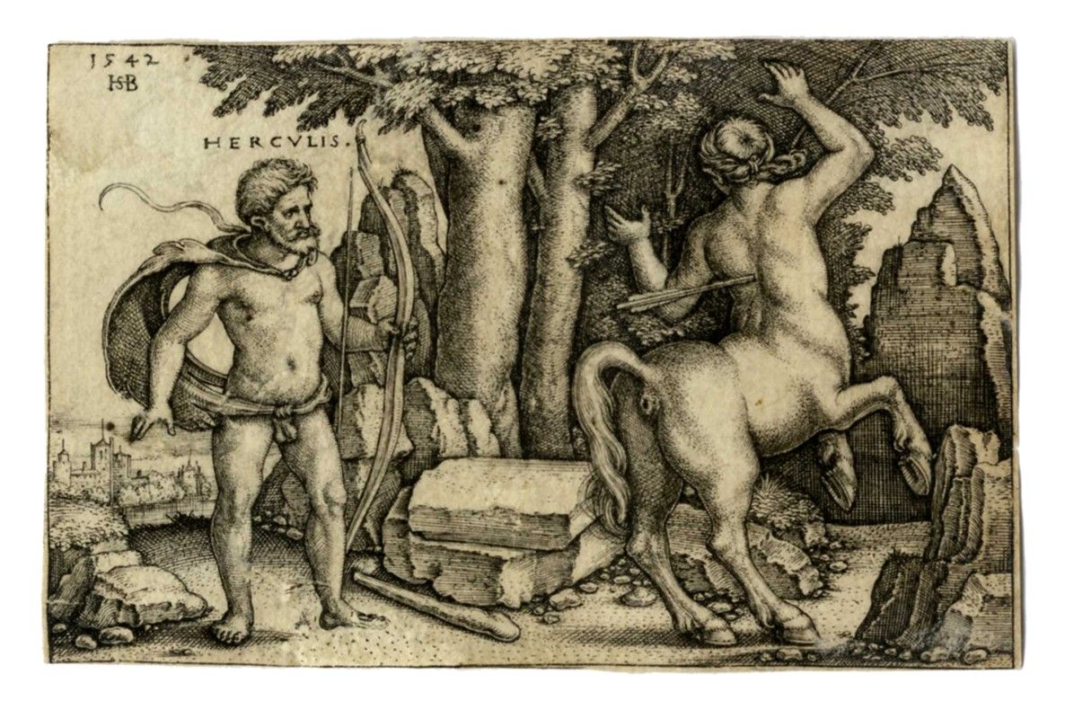 Bulino. mm 50x73. Bartsch, VIII, 97. new Hollstein, 107. Con il monogramma e la data "1542" sulla lastra in alto a sinistra. Da Le fatiche di Ercole, serie di dodici tavole tutte recanti il monogramma e datate da 1542 a 1548. Ottima impressione su carta vergellata sottile.