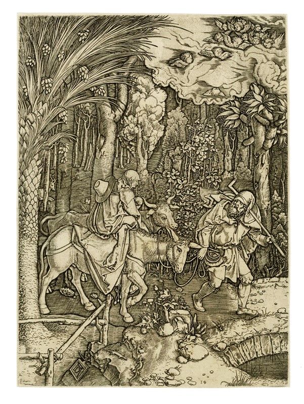 Bulino. 290x211. Bartsch, 634. Ferrara/Gaeta Bertelà, 468. Con il monogramma “AD” nel cartiglio in basso a sinistra e il numero “14” a destra. L'incisione riproduce nello stesso verso la tavola corrispondente dalla serie Vita della Vergine di Dürer, pubblicata a Norimberga nel 1511. Raimondi incise a bulino diciassette delle venti xilografie della Vita della Vergine di Dürer le ultime due tavole datate 1510. Bellissima impressione, con tracce di pulitura della lastra e dopo la comparsa del numero, su carta vergellata lievemente spessa apparentemente priva di filigrana. Al verso in basso marchio a inchiostro nero della collezione di Leopold I, Conte von Anhalt-Dessau (1676-1747) ovvero Ludwig Carl August von Wittelsbach (Strasbourg 1786-Nice 1868) (Lugt, 1708b).