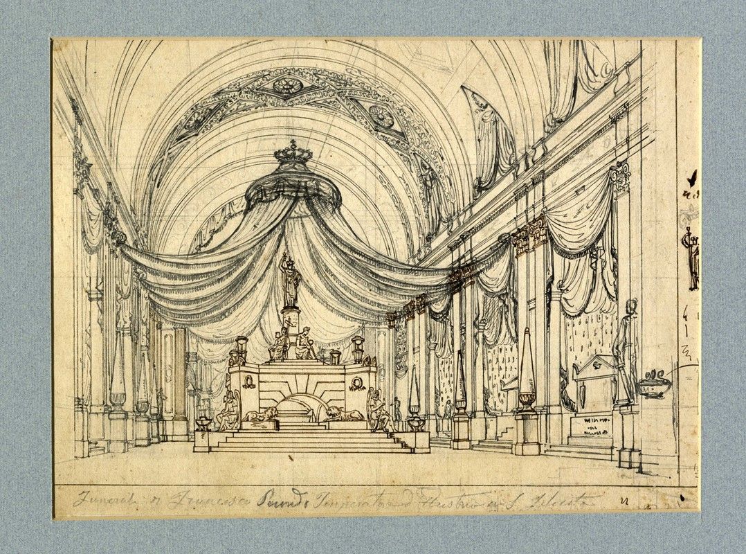 Penna e inchiostro nero e bruno, acquerello grigio, matita di grafite. Carta vergellata sottile. mm 210x280. Con il titolo a matita nella parte bassa del foglio. Il disegno raffigura l'apparato per le esequie di Francesco Giuseppe Carlo Giovanni d'Asburgo-Lorena (Firenze, 12 febbraio 1768 – Vienna, 2 marzo 1835), figlio di Leopoldo II, fu l'ultimo imperatore dei Romani, primo imperatore d'Austria col nome di Francesco I, re di Boemia e re di Ungheria, e ultimo Duca di Milano.