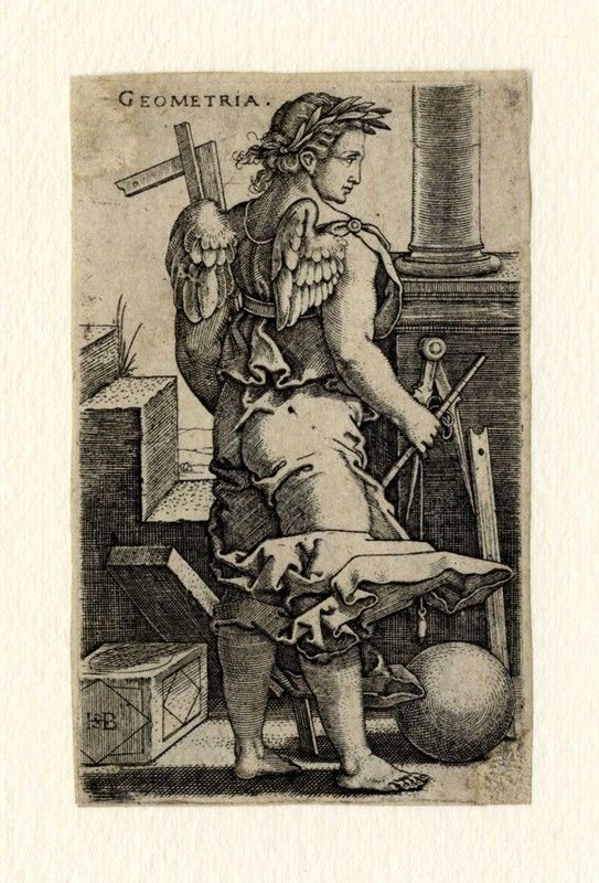 Bulino. mm 90x55. Foglio: mm 92x58. Bartsch, VIII, 126. New Hollstein, 130. Con il monogramma sul poliedro in basso a sinistra, il numero "6" parzialmente visibile all'angolo inferiore destro e il titolo in alto a sinistra. Sesta tavola dalla serie Le sette arti liberali. Buona prova nell'unico stato su carta vergellata sottile. Al verso marchio di collezione non identificato con iniziali "A.B." (Lugt, 3049).