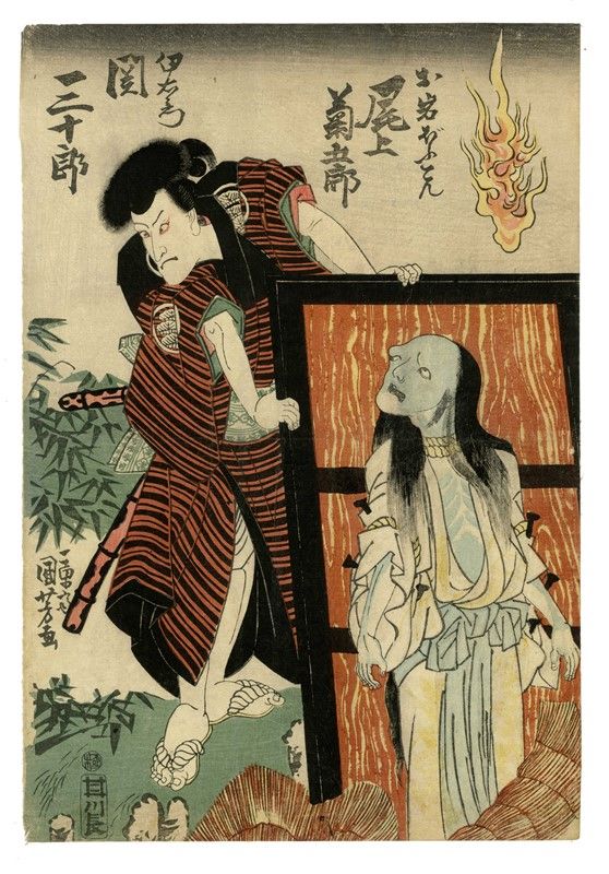 Nishiki-e (xilografia a colori). Formato: ôban tate-e verticale (mm 370x255). Firma: Ichiyusi Kuniyoshi ga. Data: Agosto 1831 (Tenpo 2). Editore: Kawaguchiya Chozo (Kawacho). Censura: kiwame. Serie: Tokaido Yotsuya (Storia di fantasmi lungo la Tokaido).