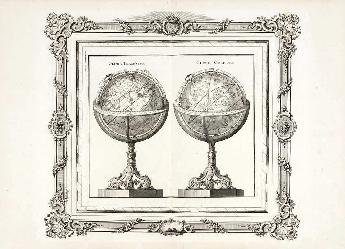 Incisione in rame. mm 235x267. Cornice decorativa su lastra separata: mm 353x58/72. Foglio: mm 394x540. Da Atlas General, Civil et Ecclesiastique,Methodique et Elementaire pour l'Etude de la Geographie et de l'Histoire, atlante destinato agli allievi de l'Ecole Royale Militaire e composto da tavole con sfere armillari, globi, raffigurazioni astronomiche, mappe degli stati e delle regioni del mondo, accompagnate da testo di Jean Charles Maclot. Bella coppia di sfere armillari su piedistallo con proiezioni del sistema solare.