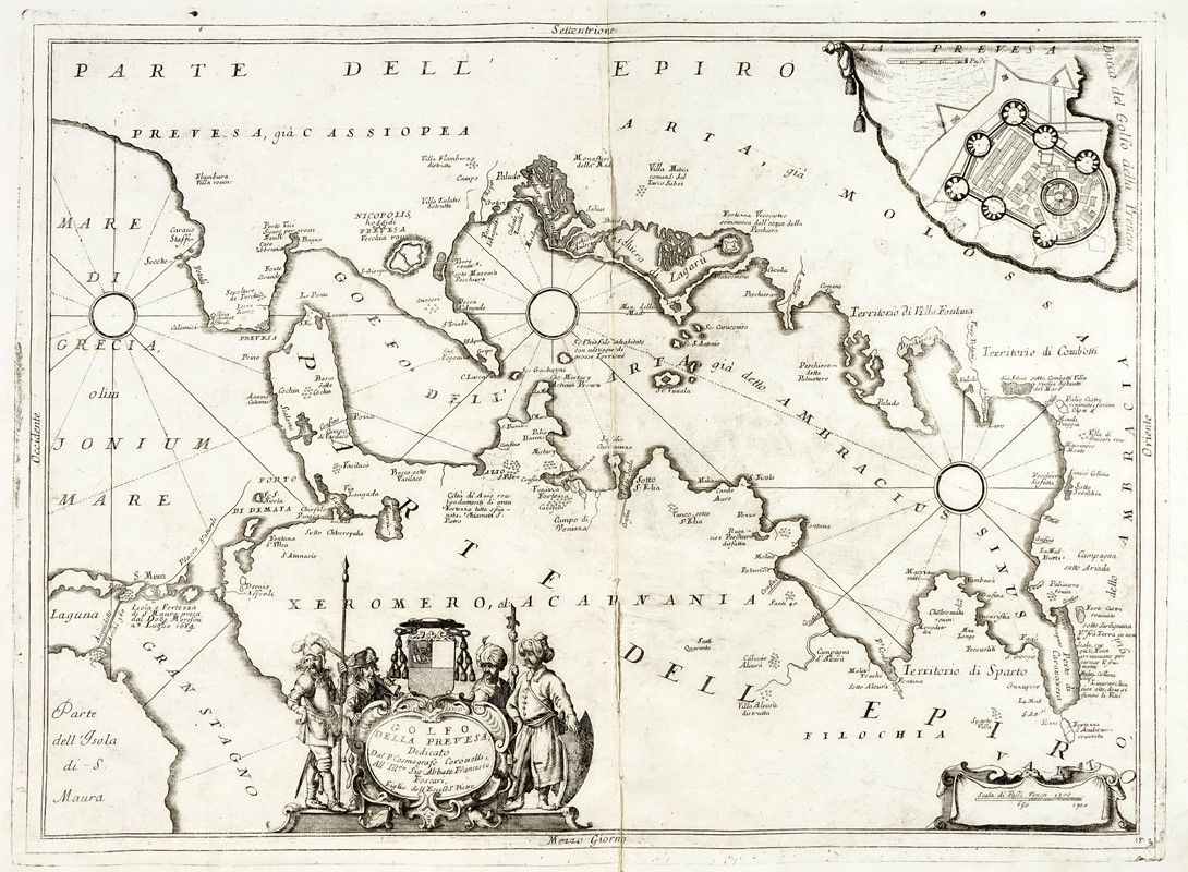 Incisione in rame. mm 460x615. Foglio: mm 490x680. Da Atlante Veneto, Nel quale si contiene la Descrittione Geografica, Storica, Sacra, Profana, e Politica, Degl'Impery, Regni, Provincie, e Stati, Dell'Universo ... Accresciuto di molte Tavole Geografiche, non piu publicate. Opera, e Studio Del Padre Maestro Coronelli Min: Convent ... Nell' Universita di Venetia, Ad Uso Dell' Accademia Cosmografica de gli Argonauti. Tomo I. In Venetia MDCXCI. Carta verosimilmente pubblicata per commemorare la cattura di Preveza, in Epiro, strappata dai Veneziani ai mori nel 1684. Viene raffigurata anche gran parte del Golfo Ambracio, oggi Golfo di Arta, uno dei maggiori bacini chiusi dello Ionio. In alto a sinistra la pianta della fortezza di Bouka, costruita dagli Ottomani a guardia dello stretto e potenziata dai veneziani dopo la conquista di Prevesa.