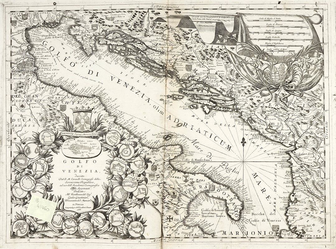 Acquaforte e bulino. mm 450x627. Foglio: mm 490x680. Dall'Atlante Veneto. La carta descrive tutti i territori prospicienti l'Adriatico, definito “Golfo di Venezia” per sottolineare il dominio della Serenissima su questo mare. In basso a sinistra compare il titolo con la dedica a Giulio Giustinian, Procuratore di San Marco, circondato da due rami di alloro con medaglioni contenenti le piante e le fortificazioni più rilevanti dell'Adriatico, quasi tutte veneziane, con i nomi riportati sul lungo cartiglio a nastro. Sopra il titolo in un ovale coricato si trova la veduta di Venezia col testo “Venetia Capital, e Dominante del Golfo”, sovrastata da stemma con aquila bicipite.