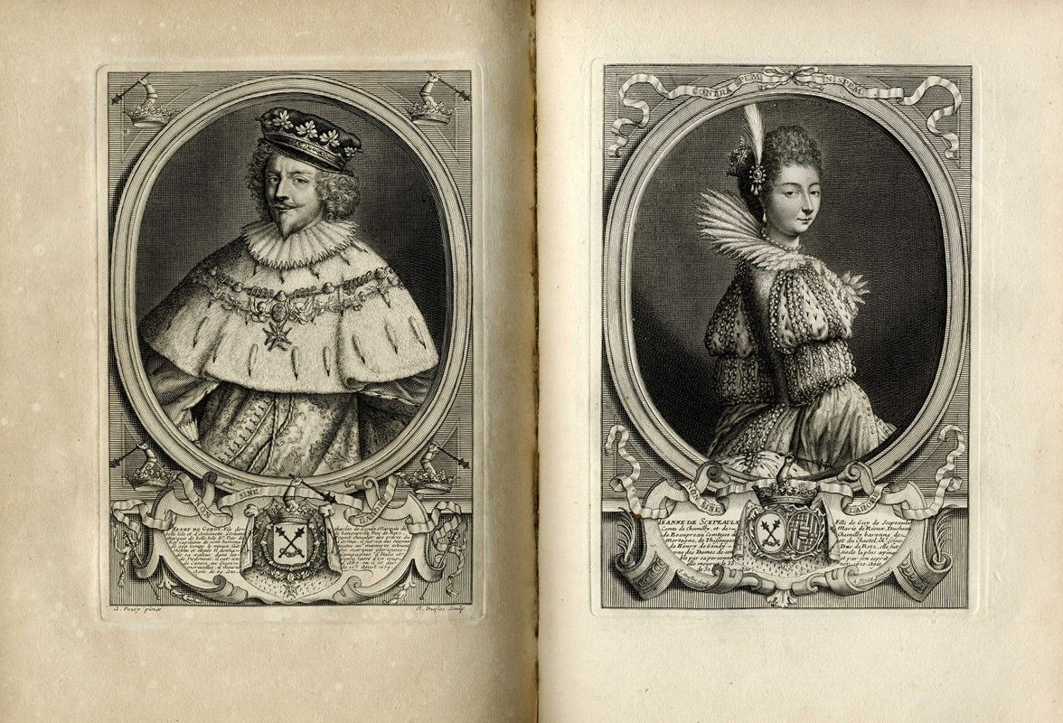 In 4° (mm 300x220). Frontespizio inciso da jean Mariette su invenzione di Antoine Pezey; 79 tavole incise a bulino da Jean Mariette, Claude Duflos e altri, tra le quali 3 alberi genealogici più volte ripiegati, stemmi, vedute di logge, palazzi, chiese, mappe e piante e 30 bellissimi ritratti di personaggi illustri della famiglia in costumi dell'epoca e del luogo. Legatura coeva in pelle marrone chiaro, dorso a 5 nervi, titolo entro tassello in pelle chiara, negli scomparti motivi floreali impressi in oro. Al contropiatto anteriore ex libris del conte di Fife. Volume di tavole dalla storia genealogica di casa Gondi pubblicata in due tomi, poco prima dell'estinzione della famiglia: l'ultima rappresentante, Marie-Catherine-Antoinette de Gondi, morì monaca il 1° luglio 1716, preceduta di soli pochi mesi dalla sorella maggiore Paule-Marguerite-Françoise de Gondi (1645-1716), duchessa di Lesdiguières per matrimonio, e mecenate dell'opera, finanziò infatti la lussuosa stampa dei due volumi. Questo secondo volume racchiude l'imponente corredo iconografico dell'opera di Corbinelli. L'autore, discendente di una famiglia fiorentina esule in Francia, godette del favore di Caterina De' Medici e di Enrico VIII, celebra in questi tomi i fasti della nobile famiglia fiorentina dei Gondi, un ramo della quale si trasferì in Francia al seguito di Caterina. Qui ebbe una rapida ascesa che diede alla Francia illustri uomini di chiesa e di armi.