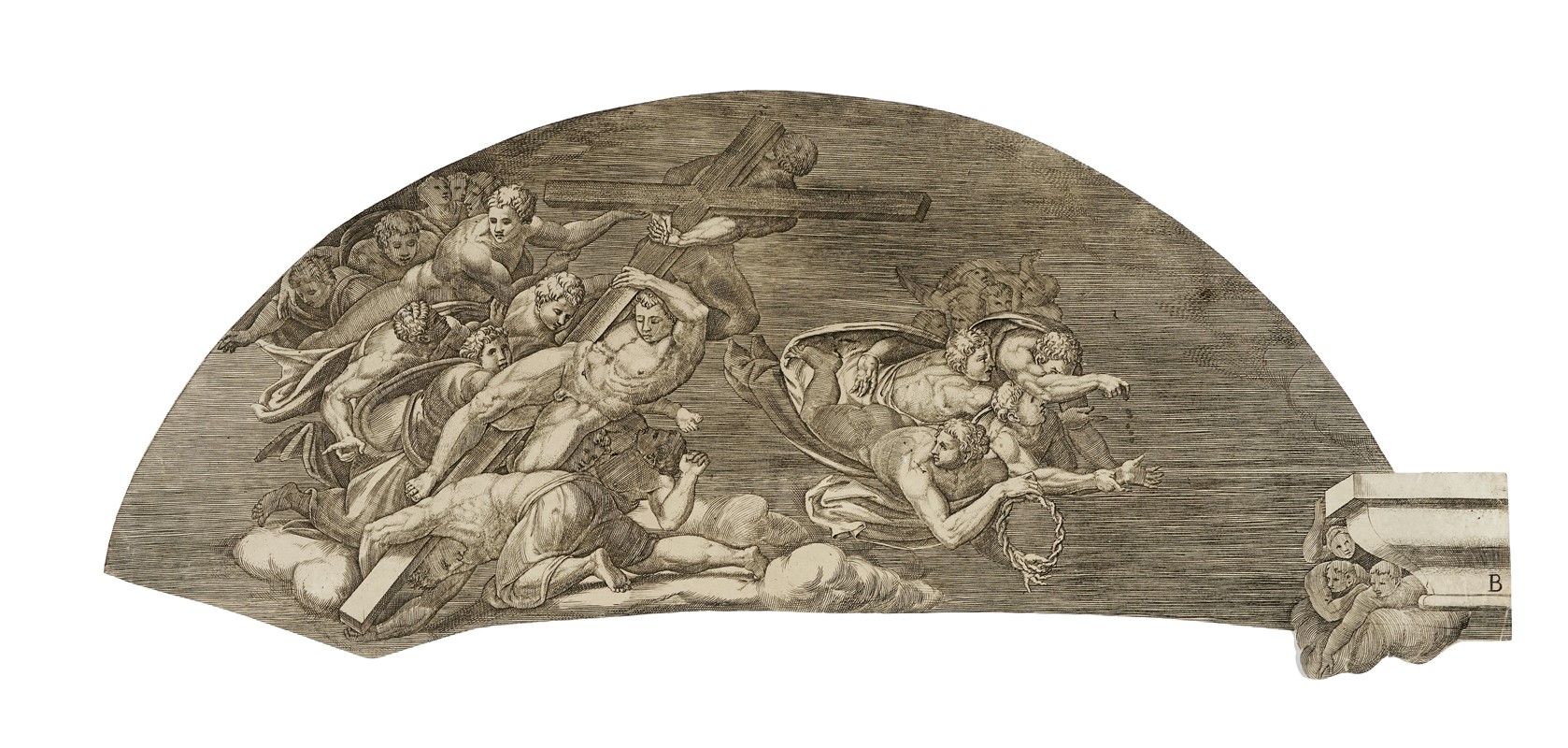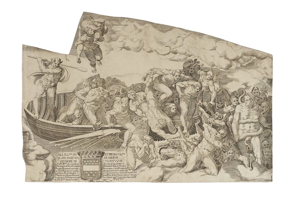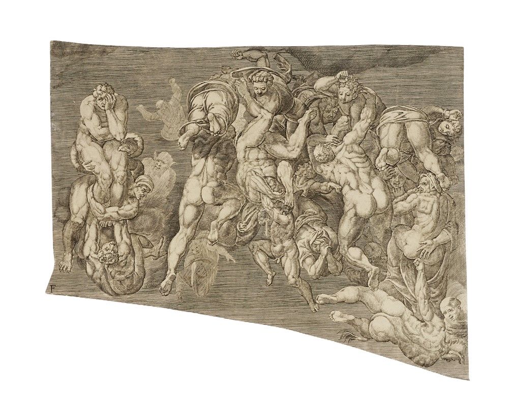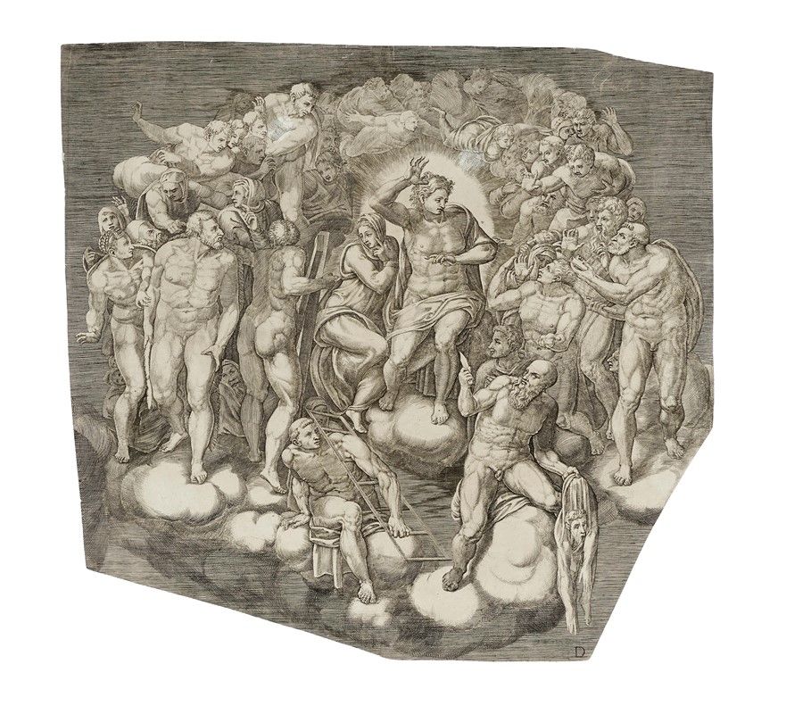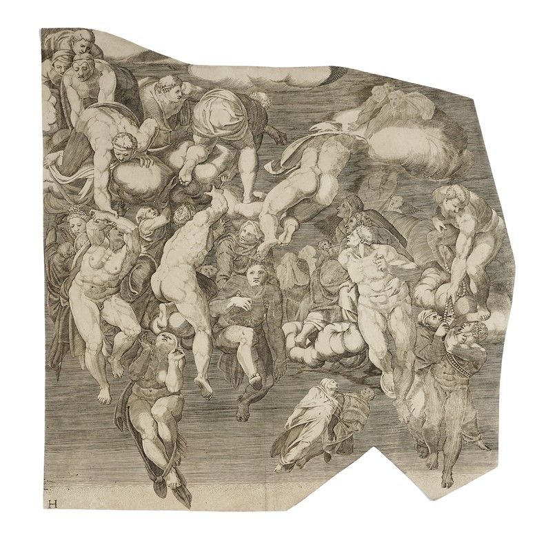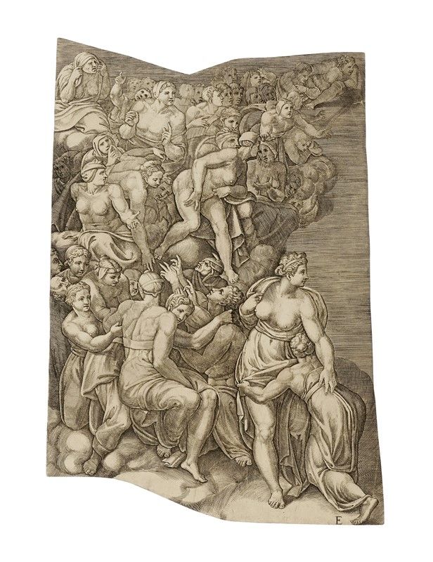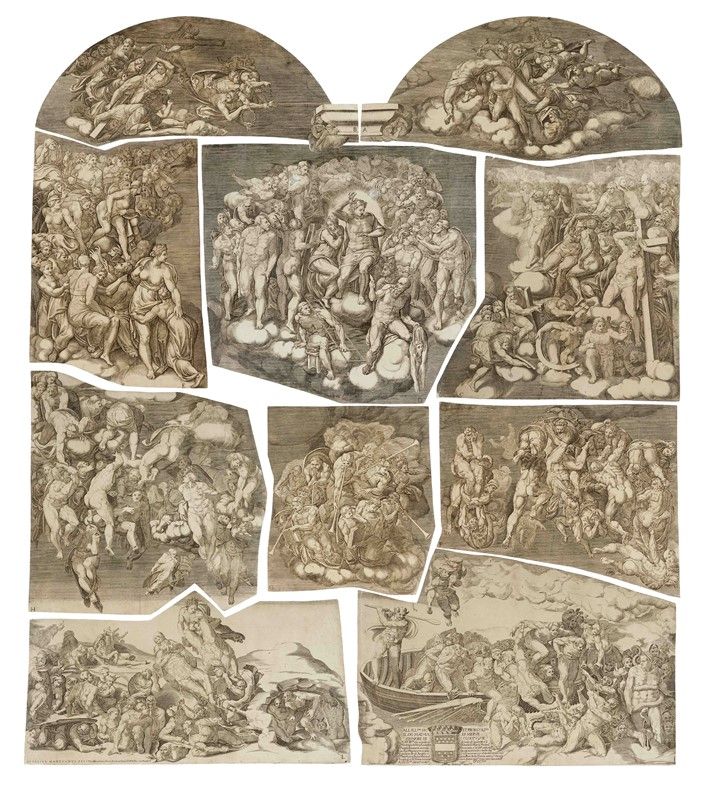 Bulino su 10 lastre di forma irregolare, l'insieme ca. mm 1200x1074. Bellini (Ghisi), 51. Boorsch/Lewis, 9. Dall'affresco di Michelangelo nella Cappella Sistina. Serie completa in 10 fogli sciolti da assemblare Le tavole A, B, E, G sono in II stato su 2 dopo l'apposizione delle lettere; le tavole C, D, F, H sono in II stato su 3 dopo la comparsa delle lettere ma prima dell'aggiunta di panneggi e ombreggiature su alcune figure. Tavola I nel IV stato di 5 con i nomi di Giacomo e Vincenzo Ceni abrasi ma prima dei panneggi sulle nudità. Tavola L nel IV stato di 5 con l'aggiunta dell'indirizzo "Io.Iacob. de Rubeis Formis Romae ad templ. S.a M.a del Pace" dopo il nome del Ghisi. Buone prove su carta vergellata lievemente rigida con filigrana "fiore di giglio in doppio cerchio su lettera M" alle tavole B,D,F, filigrana "fiore di giglio in cerchio singolo" alle tavole C,H. Al verso delle tavole A e B marchio di collezione non interamente leggibile.