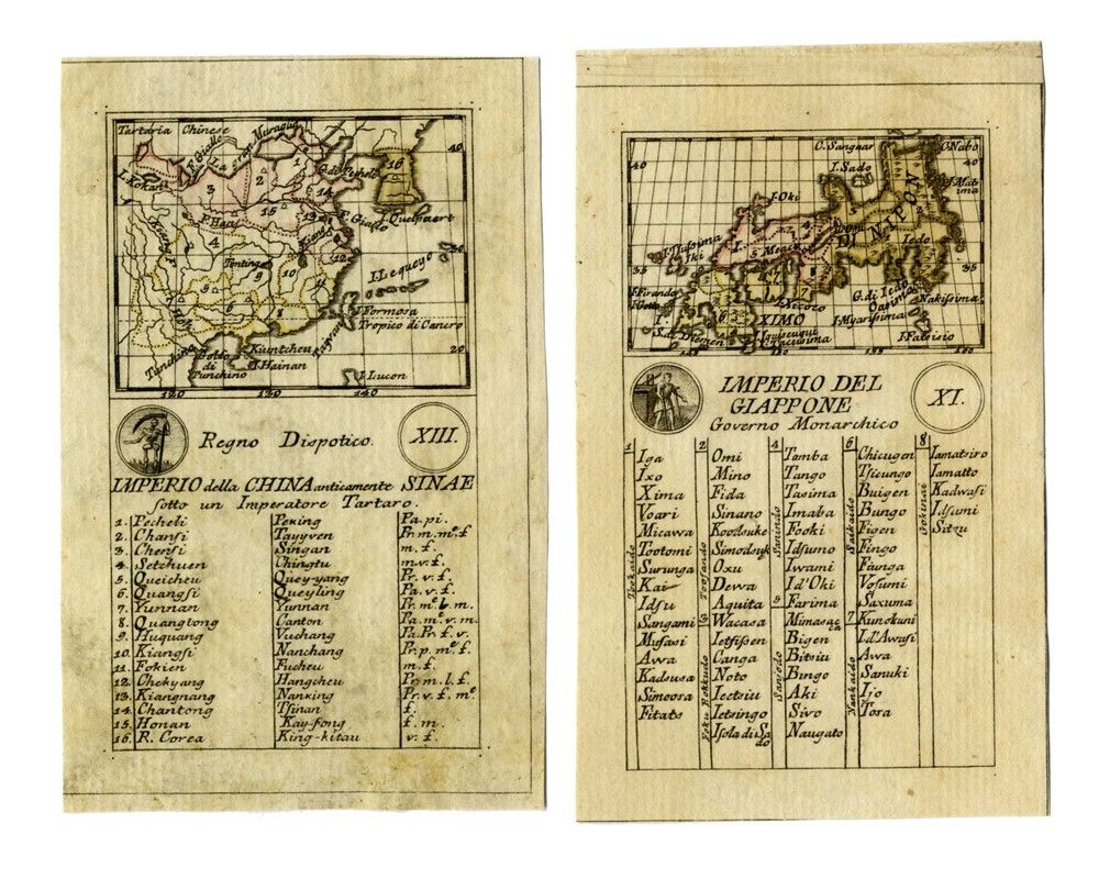 Incisione in rame in coloritura originale coeva. mm 116x70. L'articolato impero del Giappone è dettagliato da numerosi toponimi, i numeri sul territorio rimandano ai nomi dell'ampia legenda sottostante. / Imperio della China. Incisione in rame in coloritura originale coeva. mm 113x73. Nella carta si distinguono in basso il Golfo del Tonchino, l'Isola di Formosa, in alto la grande muraglia al confine con la Tartaria cinese.