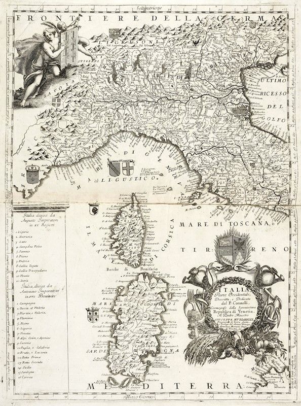 Incisione in rame. Ciascuna tavola mm 460x620. Foglio: mm 485x685. Imponente mappa dell'Italia in due tavole separate a doppia pagina, esemplificata in gran parte su quella di Giovanni Antonio Magini del 1608. Da Isolario Descrittione Geografico-Historica, Sacro-Profano, Antico-Moderna, Politica, Naturale e Poetica ... di Tutti l'Isole ... Tomo II dell'Atlante Veneto ... del P. Maestro Vincenzo Coronelli ... A 'Spese dell'Autore MDCLXXXXVI. Nell'inserto in alto a destra compare la Sicilia e si precisa come: "L'isola di Sicilia vien espressa in questa particolare Cartuccia perché la Tavola Generale annessa dell'Italia non è capace della medesima. Sono però descritte con la stessa graduazione".