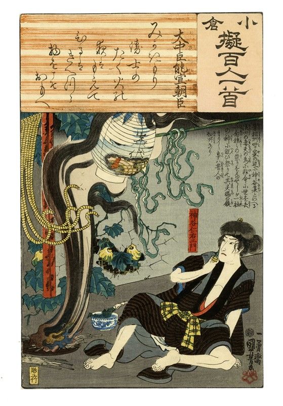 Nishiki-e (xilografia a colori). Formato: ôban tate-e verticale (mm 335x218). Firma: Ichiyûsai Kuniyoshi ga. Data: 1845-1848 (Kôka 2–Kaei 1). Editore: Ibaya Senzabur? (Dansend?). Intagliatore: Yokokawa Takejir? (Hori Take) con sigillo. Censura: Kinugasa. Serie: Ogura nazorae hyakunin isshu (Imitazioni di cento poesie di cento poeti).
