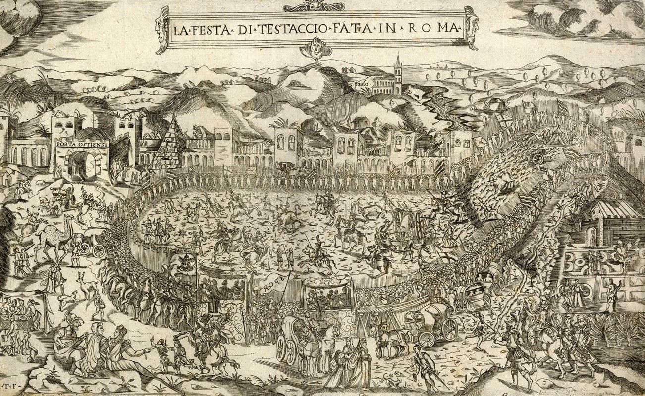 Bulino. mm 433x268. Foglio: mm 445x272. Bury (2001), 117. Marigliani (2016), VI.36. Sulla lastra in basso a sinistra il monogramma "I.T.F[ecit]" e al di sotto, entro tabella a nastro, e solo parzialmente visibile, "Romae Vincentij Luchini aeris formis ad Peregrinum. 1558". In basso a destra traccia dell'indirizzo abraso di Giovanni Orlandi da riferire all'edizione del 1602. Il monogramma "I.T" è stato da alcuni sciolto in Johann Teufel, xilografo della cerchia del Cranach. Ottima prova di questa incisione estremamente rara, impressa su carta vergellata con filigrana "ancora in ovale sormontato da stella" (Woodward, 167. 1543 ca.). La prima edizione di questa rarissima stampa, siglata con il monogramma I.T., venne edita da Vincenzo Luchino nel 1558, come da indicazione abrasa a sinistra sulla lastra. Nella parte destra è invece abrasa l'indicazione di responsabilità con il nome di Giovanni Orlandi, al quale si deve la seconda edizione del 1602. La tavola rappresenta i festeggiamenti per il carnevale a Roma, reintrodotti dopo il Sacco del 1527, da Paolo III Farnese (1534-1549), e verosimilmente è da riferire al carnevale del 1545. Di fronte alla collina artificiale di monte Testaccio, formata dai cocci delle anfore di terracotta usate per il vino e l'olio, si apriva un'ampia spianata chiamata Prati del Popolo Romano utilizzata fin dal Medioevo per feste e giochi. La tavola illustra la grandiosa festa carnevalesca, alla quale assiste anche il pontefice identificato dallo stemma sul primo piano, nella quale venne reintrodotta la giostra dei tori fatti rotolare dall'alto della collina e una volta al piano cacciati da cavalieri. Lo stemma papale è posto sulla bandiera tenuta da un soldato a cavallo. Diversi edifici e siti sono identificati da iscrizioni: "M. AVENTINO", "PORTA OSTIENSE", "S. Paulo". Sullo sfondo compaiono la tomba piramidale di Caio Cestio, gli acquedotti e le colline circostanti, mentre tra la folla vengono raffigurati vari animali, un cervo, cani e perfino un dromedario. Bibliografia: C.Marigliani, A. Marigliani, Lo splendore di Roma nell'arte incisoria del Cinquecento, Anzio-Roma, 2016