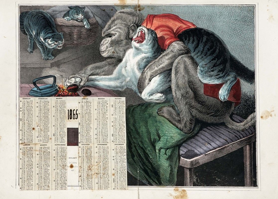 Litografia a colori. mm 315x385. Foglio: mm 330x468. Dal dipinto The cat's paw (oggi Minneapolis Institut of Art) forse l'opera più nota e controversa del pittore animalista inglese Edwin Landseer. La scena illustra crudelmente la favola La scimmia e il gatto di Jean de la Fontaine: una scimmia astuta convince un gatto a recuperare le castagne arrostite da un fornello infuocato costringendo il micio a bruciarsi le zampe. Da qui il detto «Togliere le castagne dal fuoco con la zampa del gatto», ovvero far correre ad altri i rischi e i pericoli di un’impresa, per poi godersene i frutti. Numerosi precedenti incisi e dipinti per la brutalità dell'interpretazione del soggetto, sono presenti nell'opera di artisti olandesi (David Teniers, Abraham Hondius) e britannici del XVII secolo. La fama del dipinto di Landseer fu accresciuta dalle incisioni che lo riprodussero nel corso del tempo.
