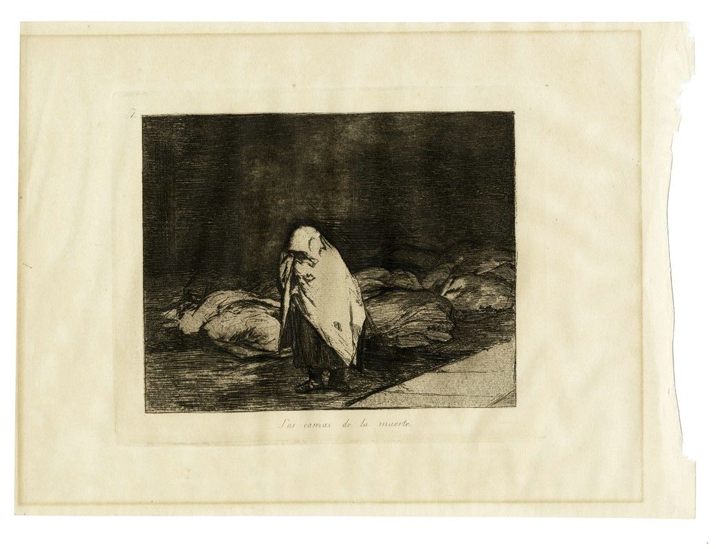 Acquaforte, bulino, puntasecca, brunitoio, lavis. mm 175x214. Foglio: 245x324. Harris, 182. Da Los desastres de la guerra, serie in 80 tavole alla quale Goya si dedicò dal 1810 al 1820, ma che venne pubblicata per la prima volta solo nel 1863. La raccolta conta sette edizioni, l'ultima delle quali realizzata nel 1937 durante la guerra civile spagnola. Ottime impressioni dalla V edizione di 7 stampata dalla Calcografia per la Real Academia nel 1923.
