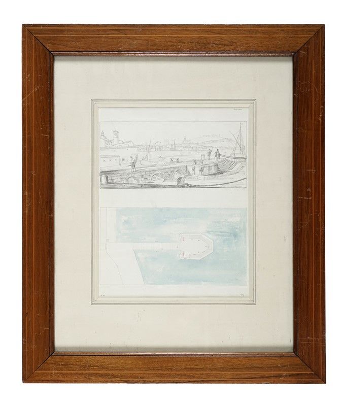 Coppia di penne inchiostro di china bruno e acquerelli su carta. mm 405x295 una, l'altra mm 245x190 (visibile). Una datata in basso a sinistra. Titoli iscritti lungo i margini. Probabili opere progettuali volte alla stampa, indicazione di tavola in basso a sinistra.