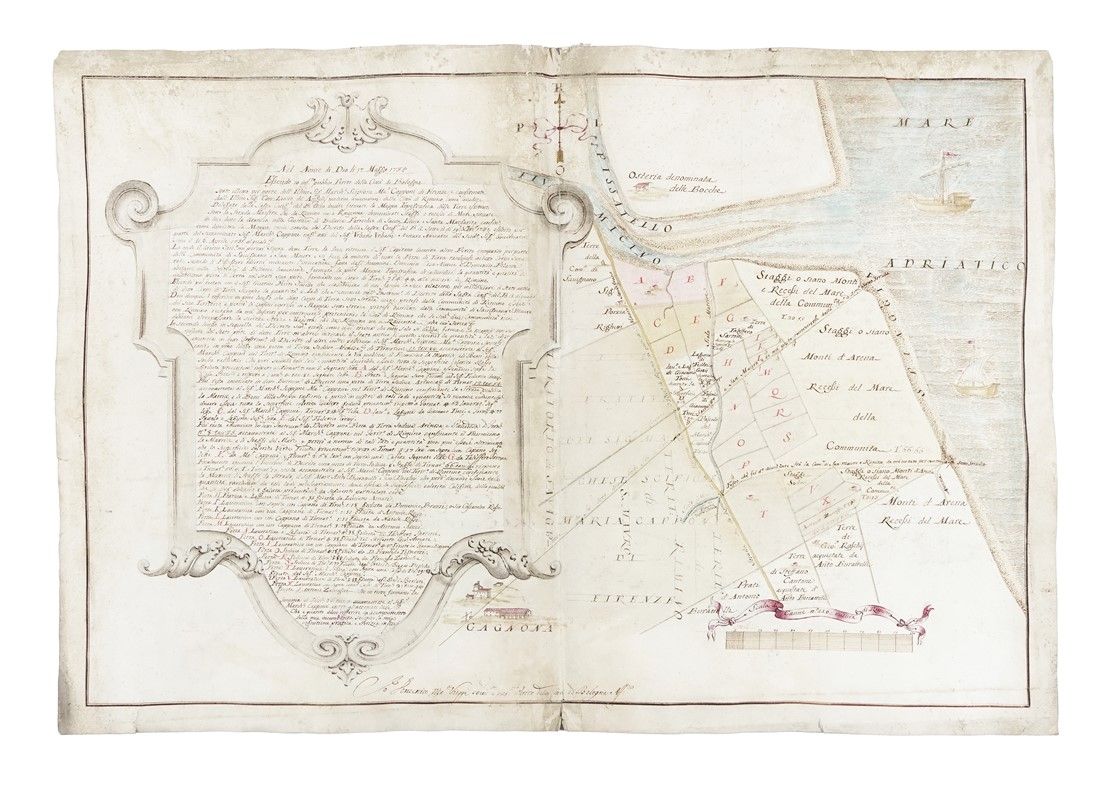 Cabreo manoscritto a penna e inchiostro bruno e pennello e acquerello a colori, carta vergellata pesante. mm 528x770. Firmato in basso al centro "Domenico Ma:a Viaggi geom: e pub: Perito della città di Bologna". La parte sinistra del foglio è occupata per intero da un grande cartiglio contenente la relazione manoscritta del perito agrimensore con i termini dell'affidamento da parte del Marchese Scipione Maria Capponi e confermata "dall Illmo Sig: Con: Lucio de' Angelis moderno Governatore della Città di Rimino"; segue legenda dei terreni contrassegnati da lettere dell'alfabeto da A a X a inchiostro rosso. A ogni lettera corrisponde una "pezza" con indicate le dimensioni, i proprietari confinanti, la tipologia (lavorativa, arenosa, paludosa, prativa, a pascolo). In basso a destra "Scala di Canne n° 110 misura di Rimino". In alto al centro rosa dei venti con vecchie denominazioni (Tramontano, Levante, Ostro, Ponente) con il Nord in alto. La parte di destra si apre sul Mare Adriatico con bella veduta di due barche a vela e in alto la foce comune del Pissatello (Pisciatello o Urgone) e del Fiumicino (Rubicone) nella zona dell'odierna Gatteo. In basso è indicata la proprietà de La Cagnona con la vasta area delle sue pertinenze.