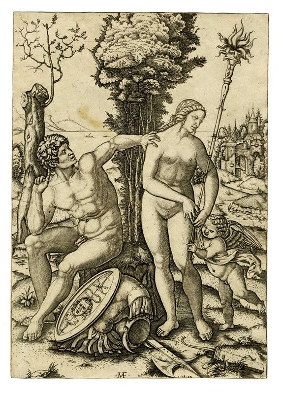 Bulino. mm 300x211. Bartsch, 345. Con il monogramma "MAF" sulla lastra in basso al centro e a seguire la data "1508. 16 D" sotto la scure. Buona prova nel II stato su 2 dopo la comparsa della collina all'orizzonte sopra la testa di Marte. Carta vergellata lievemente spessa priva di filigrana. Al verso marchio di collezione del pittore milanese Agostino Caironi (Lugt, 426).