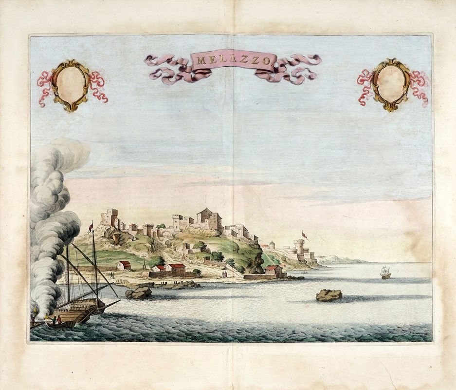 Incisione in rame in coloritura e pittura oro. mm 420x554. Foglio: mm 545x638. Testo descrittivo in latino e pianta della città su pagina singola al verso. Da Theatrum civitatum et admirandorum Italiae : ad aevi veteris & praesentis temporis faciem expressum / à Ioanne Blaeu, G.F., Amsterdam 1663, prima grande opera dedicata interamente alla cartografia della penisola italiana. I primi tre volumi dell'opera usciti nel 1663 sono dedicati allo Stato della Chiesa, a Roma e al Regno di Napoli e Sicilia. Nel 1682 a cura degli eredi escono i volumi sul Piemonte e la Savoia. Pierre Mortier nel 1704/1705 pubblica una ristampa con il titolo Nouveau Theatre de l'Italie con testo latino, francese e olandese. Un'ulteriore ristampa si deve ad Alberts negli anni 1724/1725.