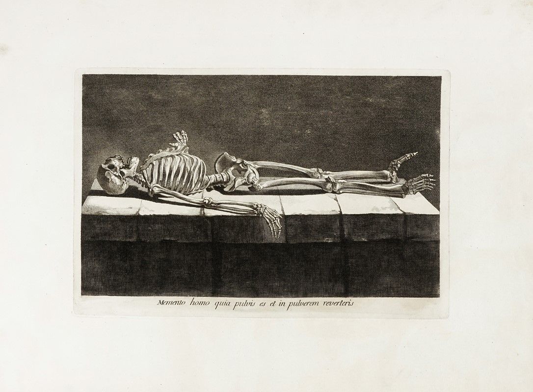 Acquaforte. mm 235x347. Foglio: mm 390x520. Grande tavola di memento mori da Nouveau Recueil d'Ostéologie et de Myologie, dessiné d'après nature par Jacques Gamelin de Carcassonne, Professeur de Peinture, de l'Académie de Saint Luc de Rome, pour l'utilité des sciences et des arts,..., suggestiva opera illustrata che vide una sola edizione e composta da due frontespizi, un ritratto, 82 tavole a piena pagina e 11 vignette inserite nel testo. Per realizzare la sua opera dedicata all'osteologia e alla miologia, Gamelin aveva allestito un laboratorio di dissezione a Tolosa, dove disegnava e incideva lui stesso le sue composizioni anatomiche fantastiche con l'aiuto di due dei suoi migliori allievi Martin e Lavallée. Alcune acqueforti recano motti incisi e rappresentano originalissimi memento mori.