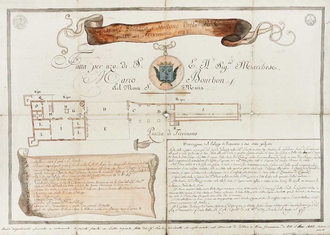 Penna e inchiostro bruno, acquerello a colori, carta vergellata pesante. mm 570x815. La parte superiore della tavola è occupata dal titolo entro grande cartiglio a nastro, segue scrittura esplicativa con al centro il blasone della famiglia Bourbon del Monte con i gigli di Francia. Al centro la pianta del castello con a sinistra il corpo centrale dai torrioni angolari, dove la divisione degli ambienti è contraddistinta da lettere da A a R sciolte nella legenda sottostante, e i lati lungo le parti scoscese indicati con "ripe". Procedendo verso destra si incontrano la casa del Marchese Pompeo con il cortile e il portico e infine, nella parte finale, la pianta del grande Stallone, con affaccio sulla Piazza di Trevinano. Nella parte in basso a destra si legge la Descrizione del Palazzo di Trevinano e suo stato presente, con la dichiarazione finale sottoscritta e la data "[...] detto Disegno di Pianta, misura e Descrizione, è stata fatta da me sottoscritto con l'assistenza del Sig. Procuratore fiscale della R.C.A. Questo di 15.X.1723 Nicola Del Caretto m.o prop.a". Nel 1187, a seguito di un trattato di pace tra le città di Acquapendente e Orvieto, l’abitato di Trevinano venne concesso ai figli di Sinibaldo Visconti di Cambiglia. I Visconti di Campiglia restarono a Trevinano fino al 1327, poi i Monaldeschi del ramo della Cervara subentrarono dal 1327 al 1592; in seguito Trevinano fu diviso dalla Reverenda Camera Apostolica, tra la famiglia Simoncelli e gli eredi dei Monaldeschi. Nel 1687 la Camera Apostolica entrò in possesso di tutto il territorio riunificato e lo cedette in feudo ai Bourbon del Monte. Dopo essere stato circa 300 anni possedimento della famiglia Bourbon del Monte, il castello è diventato proprietà dei Boncompagni-Ludovisi. Il castello, che ancora reca sul portale lo stemma dei Monaldeschi della Cervara, è attualmente proprietà del Principe Paolo Francesco Boncompagni-Ludovisi. In basso al recto con prosecuzione al verso, nota manoscritta datata 18 aprile 1826, di Gioacchino Maria Farinetti, Segretario Cancelliere della Reverenda Camera Apostolica, in cui si attesta la corrispondenza esatta della pianta presente a quella depositata presso la Reverenda Camera Apostolica. Con timbri della Reverenda Camera Apostolica.