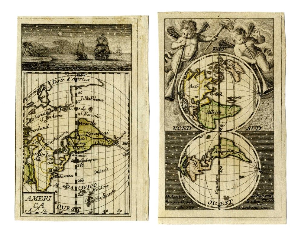 Incisione in rame con confini in coloritura originale coeva. mm 106x64. In basso sulla lastra le indicazioni di responsabilità dell’opera "D. Agostino da Rabatta / Barone Gio. de Baillou / Aniello Lamberti inc.". / AMERICA. Incisione in rame con confini in coloritura originale coeva. mm 103x67. Carta del Nord e Sud America e lateralmente parte dell'Europa e dell'Africa. Segnate anche Islanda, Groenlandia, l'isola di Sant'Elena, le Azzorre, le Galapagos. Nella parte superiore della carta, piccola veduta delle tre caravelle sotto il cielo stellato.