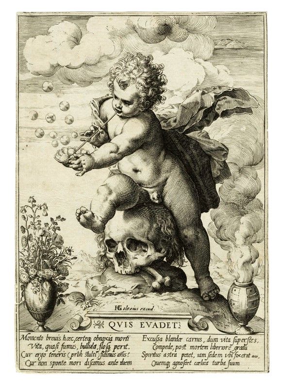 Bulino. mm 220x156. New Hollstein, 529. Vanitas, allegoria della caducità, che già nel titolo (Chi può sfuggirè) allude all'impossibilità di eludere il destino che ci concede di vivere quanto una bolla di sapone. Il messaggio è affidato a un putto che a cavallo di un teschio soffia bolle dalla breve vita; alla sua sinistra, un vaso di fiori e a destra un'urna dalla quale si leva una colonna di fumo. Bellissima prova, nel I stato avanti la comparsa dell'indirizzo di Claes Jansz Visscher, stampata con contrasto netto e pienezza di segno su carta vergellata con filigrana in cerchio singolo sormontato da fiore a quattro petali.