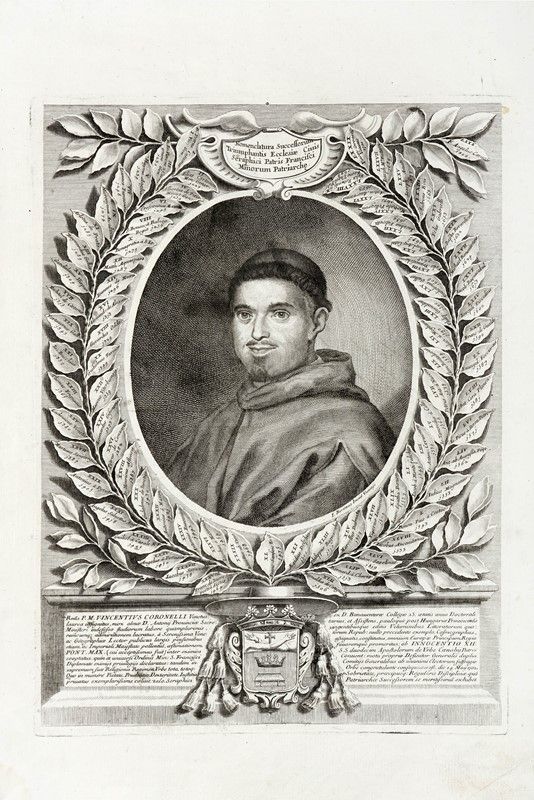 Bulino. mm 375x277. Foglio: mm 490x340. Ritratto del noto geografo, cartografo, cosmografo ed enciclopedista tratto da Cronologia universale, che facilita lo studio di qualumque storia e particolarmente serve di prodromo alli 45. volumi della biblioteca, consecrata all'eminentissimo prencipe fra Vincenzo Maria Orsini ... da fra Vincenzo Coronelli minor conventuale ad uso dell'Accademia cosmografica degli Argonauti. [Venezia: s.d., ma 1707].