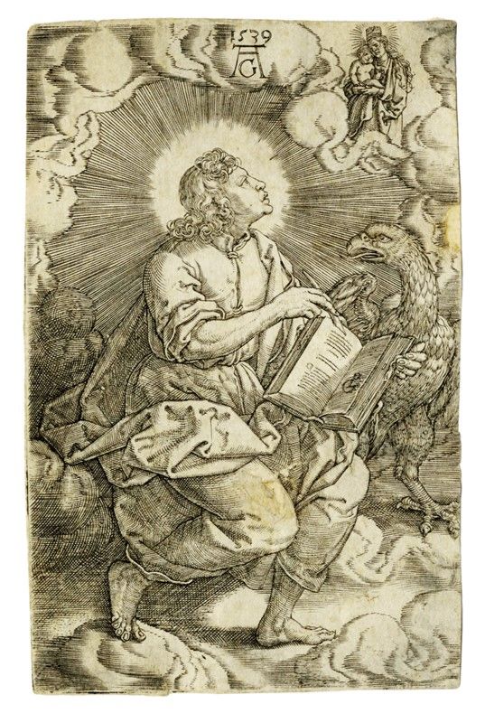Bulino. mm 122x77. Bartsch,VIII, 60. New Hollstein, 60. Siglato con il monogramma di Aldegrever e datato "1539" in alto al centro. Sul libro aperto compare il monogramma di Pencz autore dei disegni per la serie. Da una serie di quattro dedicata agli Evangelisti. Buona prova ancora con leggibilità di segno seppur debole, su carta vergellata sottile. SI AGGIUNGE: Id., Susanna e i vecchioni. 1555. Bulino. mm 115x78. Foglio: 121x85. Bartsch, 30. New Hollstein, 30. Monogrammata e datata "1555" nella tavoletta in basso al centro. Prima tavola da una serie di quattro dedicata alla storia di Susanna. Buona prova di questo raro bulino su carta vergellata con grande filigrana con doppio cerchio.