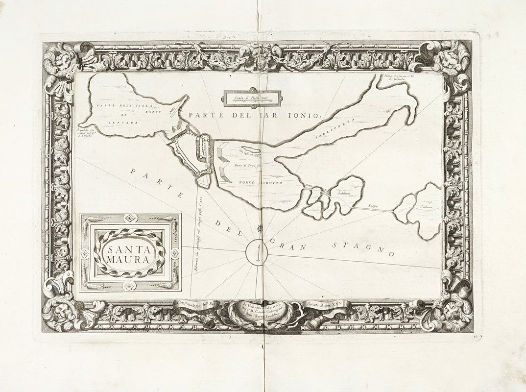 Incisione in rame. mm 270x434. Foglio: mm 490x670. Cornice decorativa su lastra separata: mm 50x533. Pianta dell'sola greca di Leucade, Santa Maura secondo la denominazione veneziana. Da Citta, fortezze, isole, e porti principali dell'Europa, in planta, et in elevatione, descritte, e publicate ad uso dell'Accademia Cosmografica degli Argonauti, in Venezia 1689. L'isola, possedimento ottomano, cadde sotto il dominio veneziano dopo un assedio durato dal 21 luglio al 6 agosto 1684. L'evento fu l'inizio della sesta guerra ottomano-veneziana chiamata anche Guerra di Morea.