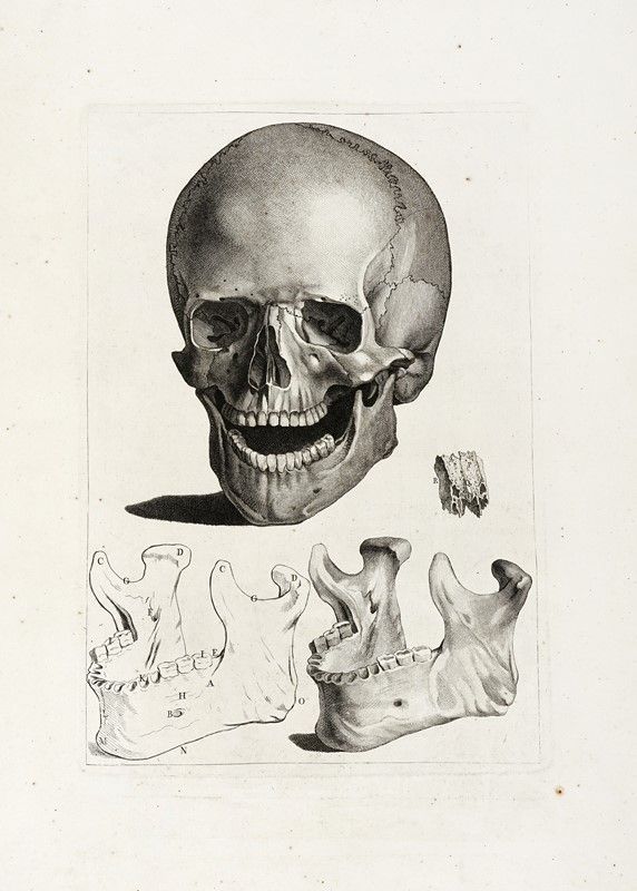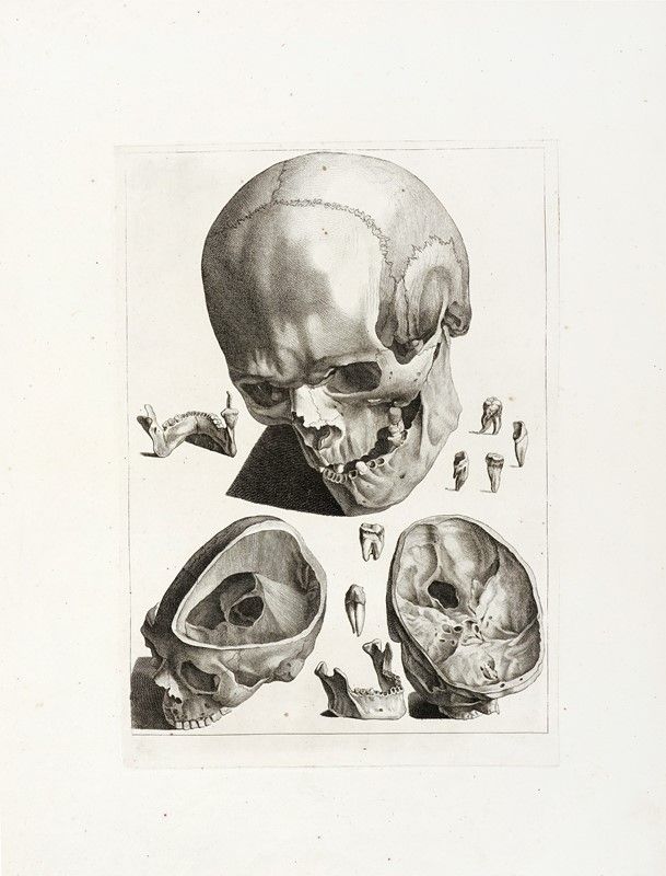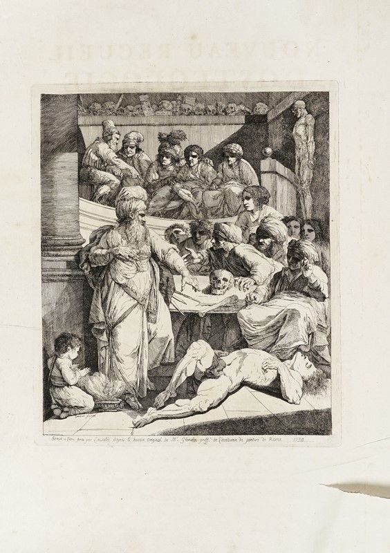 Acquaforte. mm 185/353x230/250. Foglio: mm 518x388. Lotto composto da: tavola di frontespizio con Lezione di anatomia datata 1778. Titolo inciso (con suggestiva vignetta raffigurante la Morte sul campo di battaglia con la data 1778), Prospectus inciso (raro), due grandi illustrazioni fuori testo su foglio integro e una piccola, raffiguranti il cranio e le sue ossa. Tutte le tavole provengono da Nouveau Recueil d'Ostéologie et de Myologie, dessiné d'après nature par Jacques Gamelin de Carcassonne, Professeur de Peinture, de l'Académie de Saint Luc de Rome, pour l'utilité des sciences et des arts,..., suggestiva opera illustrata che vide una sola edizione e composta da due frontespizi, un ritratto, 82 tavole a piena pagina e 11 vignette inserite nel testo. Per realizzare la sua opera dedicata all'osteologia e alla miologia, Gamelin aveva allestito un laboratorio di dissezione a Tolosa, dove disegnava e incideva lui stesso le sue composizioni anatomiche fantastiche con l'aiuto di due dei suoi migliori allievi Martin e Lavallée. Alcune acqueforti recano motti incisi e rappresentano originalissimi memento mori.