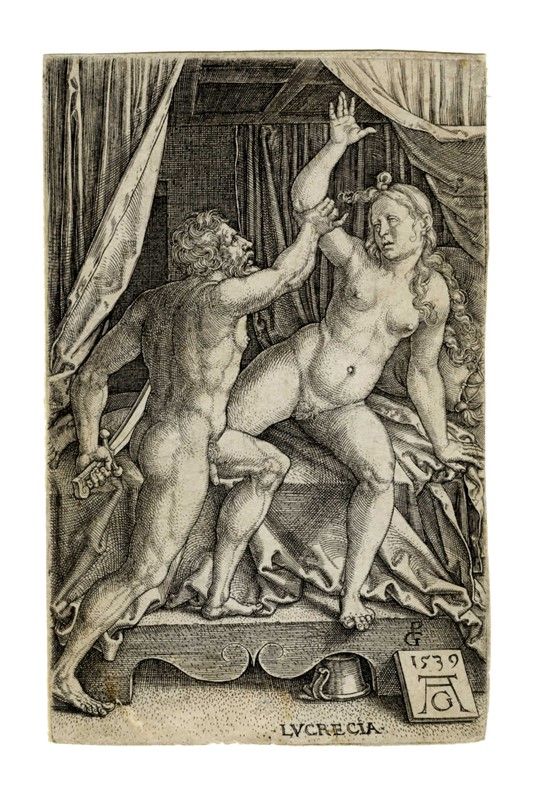 Bulino. mm 123x78. Bartsch, VIII, 63. New Hollstein, 63. Firmato con il monogramma di Aldegrever e datato "1539" sulla tavoletta in basso a destra. II stato di 2, dopo l'aggiunta del monogramma di Pencz autore dell'invenzione (il soggetto pare verosimilmente tratto da un disegno perduto) sopra la tavoletta con quello di Aldegrever. In basso al centro la scritta "LUCRECIA". Bella impressione di questa piccola e rara stampa, su carta vergellata sottile priva di filigrana.