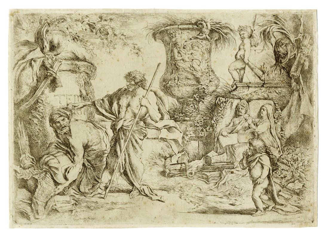 Acquaforte. mm 180x259. Foglio: mm190x265. Bartsch, XXI, 27. Bellini (castiglione), 63. Sulla lastra in basso a sinistra "Gio Benedetto 1655". Uno dei due pastori indica parte del titolo inciso sul rudere circolare a sinistra. Buona prova, anche se impressa più debolmente, nel IV stato di 5 dopo il ritocco nel terreno sul primo piano ma con ancora percepibili il tratto verticale sul braccio del bambino a destra e il prolungamento della crepa del bassorilievo che ancora lambisce la mano di una delle due donne. Carta vergellata sottile con frammento di filigrana non interamente leggibile.