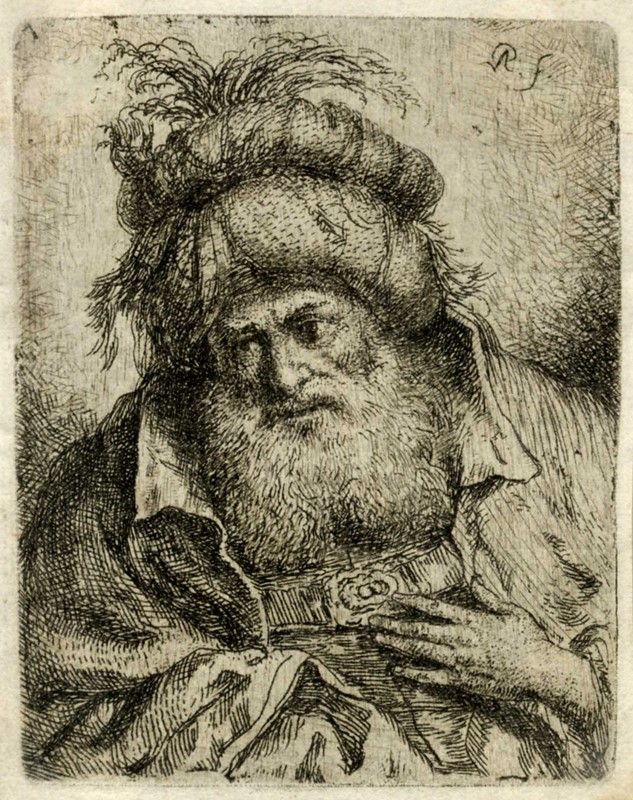 Acquaforte.mm 75x60. Foglio: mm 80x64. Sulla lastra in alto a destra "R.f". Piccola acquaforte alla maniera di Rembrandt, al quale l'incisore rende omaggio con il soggetto e con il monogramma.