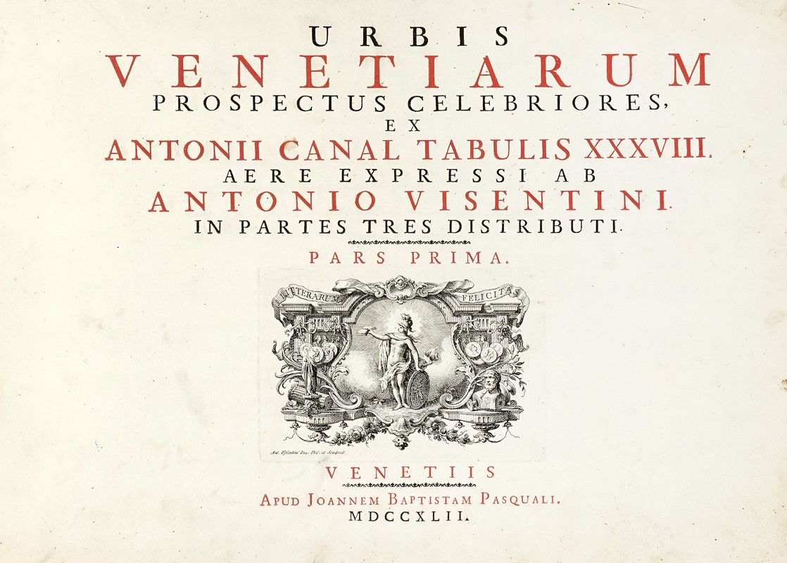 In folio oblungo (mm 351x516). Legatura in mezza pelle coeva, piatti in cartonato pesante, dorso a cinque nervi con comparti decorati a melograne impresse in oro, titolo abraso. Angoli in pelle verde. Tagli rossi. La serie fu commissionata dal console Joseph Smith che incaricò Visentini di riprodurre i dipinti del Canaletto nella sua collezione. L'opera ebbe inizio nel 1728 e fu portata a termine nel 1735 con un'edizione di sole 14 tavole, solo nel 1742 la serie venne pubblicata in prima edizione completa comprensiva di trentotto vedute divise in tre parti e numerate rispettivamente I-XIV, 1-12, I-XII. Esemplare completo e omogeneo delle tre parti, con tre frontespizi tipografici stampati in rosso e nero e vignette incise dal Visentini. Al frontespizio della prima parte seguono l'indice tipografico delle vedute Tabularum series, un titolo inciso figurato (il medesimo della prima edizione del 1735 con lanuova data MDCCXLII preceduta dalla scritta Elegantius recusi), il doppio ritratto di Canaletto e Visentini nel II stato di 3 dopo i ritocchi a bulino e la modifica dell'iscrizione in "Ex Monochromate Io. Bapt. Piazzetta". Bellissime impressioni nel II statodi 5 e nel I stato di 4, prima della sostituzione del titolo latino con titoli in italiano e francese e il cambio della numerazione, stampate su carta vergellata veneta con filigrana "balestra e contromarca Z" (Succi, 1986, p. 128, nn.3,4) segnalata per questa edizione e visibile su gran parte delle tavole. Succi (2013), pp. 175-217.
