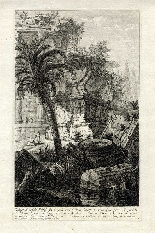 Acquaforte, bulino e puntasecca. mm 385x235. Foglio: mm 444x305. Robison, 16. Con la firma al margine sinistro in basso, il numero "5" all'angolo inferiore destro. Da Prima parte di architetture e prospettive inventate ed incise da Gio. Batta Piranesi architetto veneziano dedicate al sig. Nicola Giobbe, opera composta da frontespizio e 12 tavole pubblicata per la prima volta a Roma dai fratelli Pagliarini nel 1743 e di nuovo in Opere varie da Bouchard nel 1750 con due tavole aggiuntive e il titolo cambiato. Bellissima prova nel I stato di 2 dalla prima edizione terza uscita (1747- ca.1835), stampata con inchiostrazione piena e brillante su carta vergellata pesante apparentemente priva di filigrana.