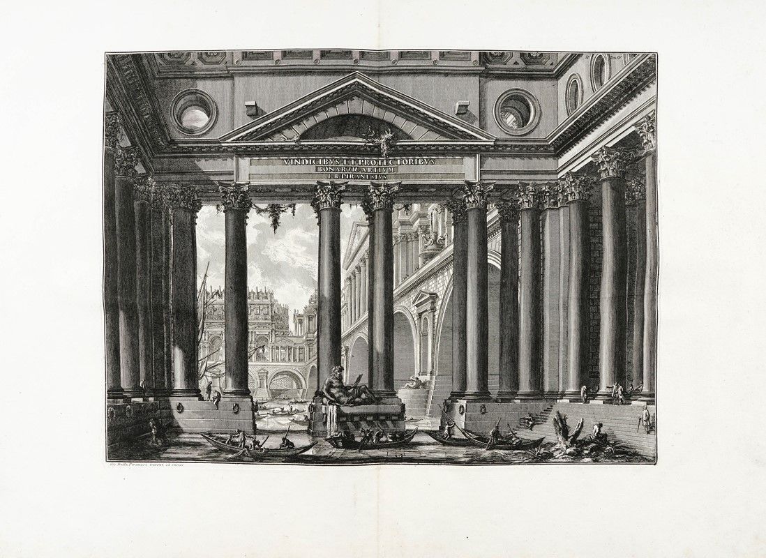 Acquaforte e bulino. mm 403x537. Foglio: mm 555x790. Focillon, 338. Wilton-Ely, 471. Ficacci, 329. Tavola II di frontespizio al IV Tomo de Le Antichità Romane serie edita per la prima volta nel 1756 a Roma da Bouchard & Gravier e pubblicata nuovamente postuma nel 1784. Splendida impressione su carta vergellata lievemente spessa con vergella appena percettibile e apparentemente priva di filigrana.
