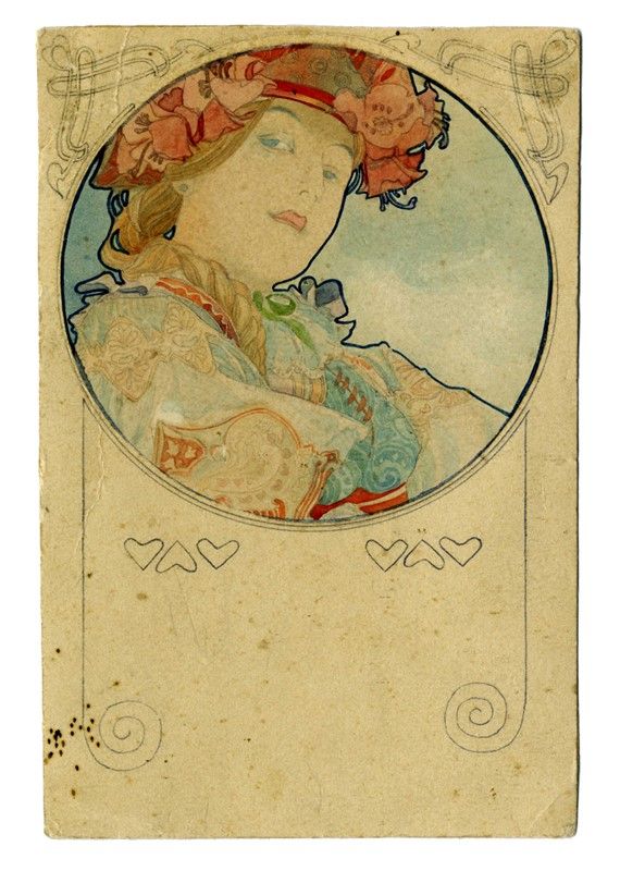 Matita, acquerello e china su carta sagomata circolare applicata a carta di supporto. mm 140x90. "DOPISNICE" (cartolina) iscritto a matita sul verso del supporto sopra l'iscrizione "X. V. 1909". Probabile studio progettuale per cartolina postale. Ottima mano nell'esecuzione del soggetto centrale. Il foglio circolare è applicato e circondato da elaborate cornici dal sapore liberty e piccoli cuori al margine inferiore. Anche se priva di firma, questa bella illustrazione racchiude molti elementi distintivi di Mucha: soggetto, elaboratissimi abiti con pattern misti e merletti, ombreggiature acquerellate e contorni fortemente marcati a china per delineare la silhouette della figura.