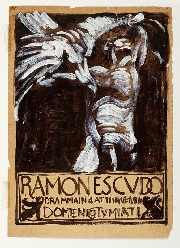 Acquerelli su carta greve. mm 310x220. Iscritto "RAMON ESCUDO / Dramma in 4 atti in versi di / Domenico Tumiati" nel riquadro al margine inferiore. Bozzetto per l'opera presentata per la prima volta il 12 Maggio 1904 al Teatro Eleonora Duse di Bologna.