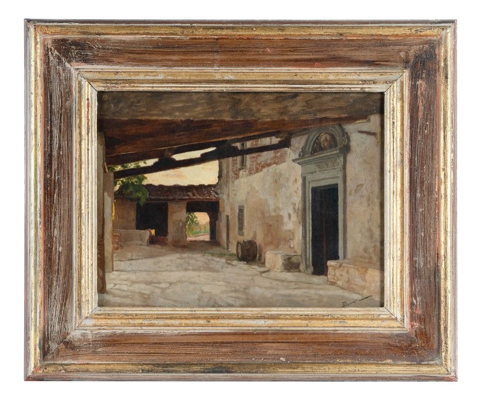 Olio su tela. cm 30x40. Firmato in basso a destra. Bozzetto per l'omonimo quadro datato 1869. Nella versione finale del dipinto troviamo una cerchia di familiari raccolta intorno al giovane militare in partenza. Borrani nell'opera vuole sottolineare le umili origini del nucleo familiare lasciando tutte le figure, meno che il soldato, scalze.