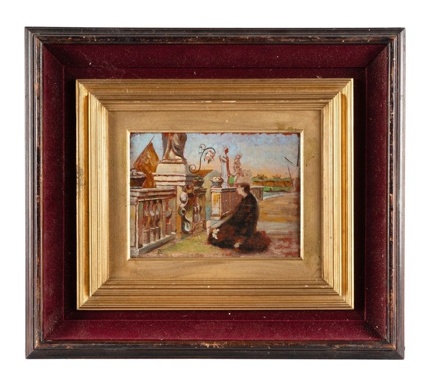 Olio su tela applicata a cartone. cm 17,4x24. Monogrammato in basso a sinistra. Dello stesso soggetto Luigi Nono ne esegue varie versioni, una presenta la figura china incappucciata, realizzata del 1881. La seconda, molto più simile a questo piccolo bozzetto, sarà invece del 1882, esposto poi a Roma nel 1883. Infine, in Le due madri, Nono riprende la stessa ambientazione per cambiare soggetto ed orientamento della tela, sviluppando il contenuto in verticale.