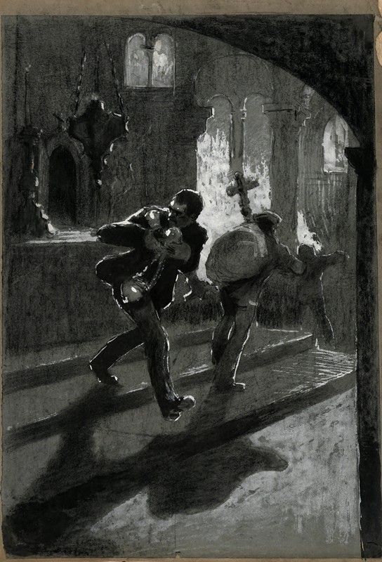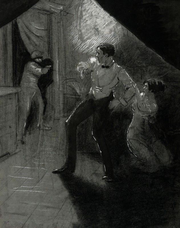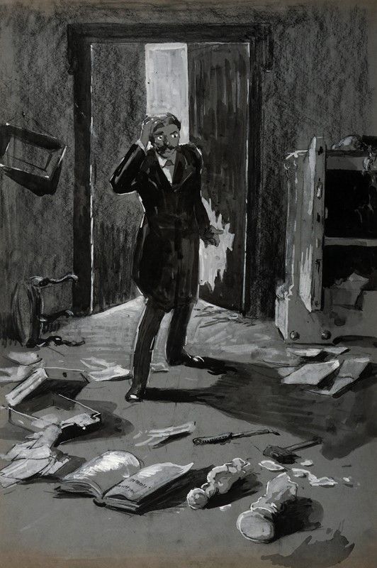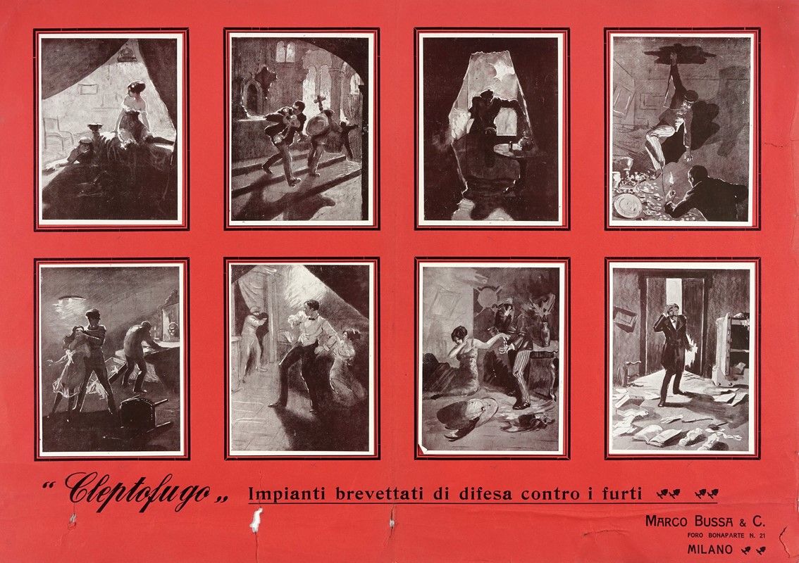 Raccolta di 8 carboncini su carta applicati su 7 fogli di supporto. mm 500x350 ca. cad. Graziosi progetti di manifesti pubblicitari per l'azienda di antifurti Cleptofugo. SI AGGIUNGONO: Coppia di riproduzioni in miniatura dei precedenti manifesti applicati su bifolio con iscritto a stampa: "Cleptofugo - Impianti brevettati di difesa contro i furti". mm 500x350 (chiuso).