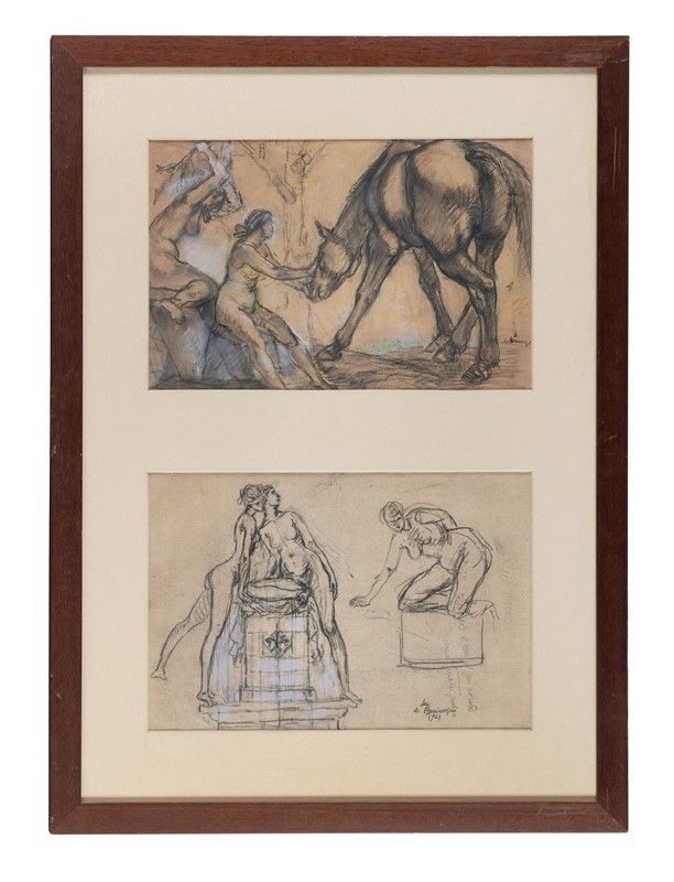 Carboncino, matita, sanguigna e gesso su carta. mm 230/245x366 cad (visibili). Quello superiore è firmato in basso a destra e quello inferiore è firmato e datato in basso a destra.
