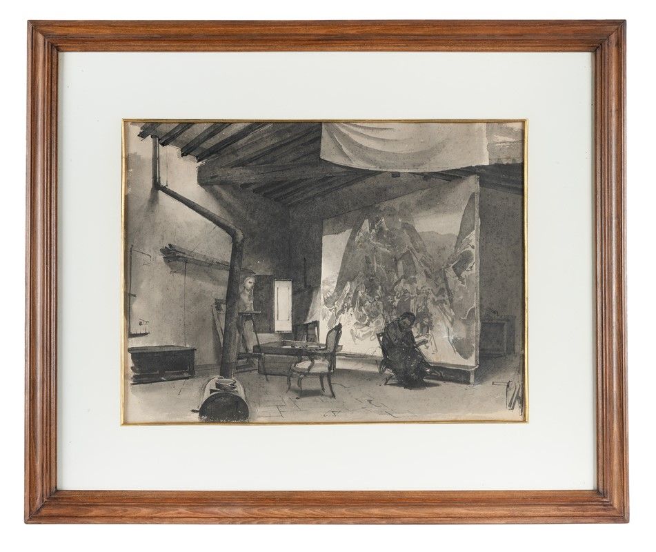 Acquerello su carta. mm 430x590 (visibile). Monogrammato in basso al centro. Etichetta a stampa con iscritto "Mostra La Forza del vero / I Pittori moderni della realtà / Pietro Annigoni / Interno dello studio / in Piazza Santa Croce, 1945 / Opera n. 8" applicata sul verso.