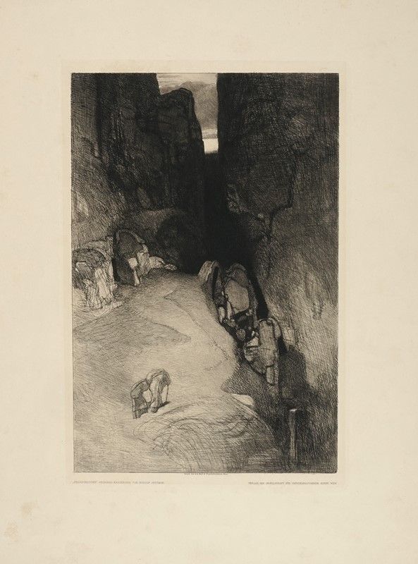 1) Konupek J., West Bohemian Baroque. 1918. Acquaforte. mm 340x435. Foglio: mm 480x585. Firmata a matita in basso a destra, vicino all'iscrizione postuma "Inv. e fec.". "110" a matita in basso a sinistra. Note di proprietà al verso. 2) Jettmar R., Felsschlucht. Acquaforte. mm 375x250. Foglio: mm 560x455. Dati editoriali impressi al margine inferiore della lastra.