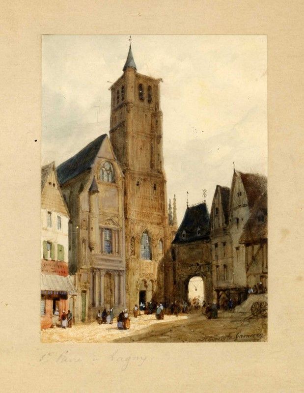 Coppia di matite e acquerelli su carta. mm 125x100 cad. Entrambi firmate a china bruna in basso a destra. Compongono il lotto le viste di St. Maclou à Rouen e St. Pierre à Lagny.