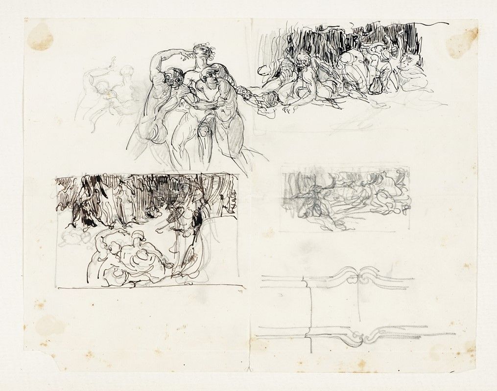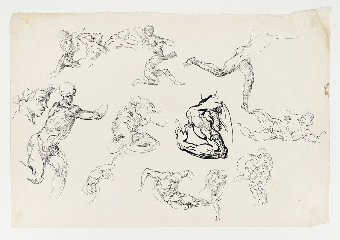 Raccolta di 3 penne e inchiostro di china e matite su carta. mm 220x280/300. Compongono il lotto studi anatomici, bozzetti per incisioni e per pannelli pittorici.