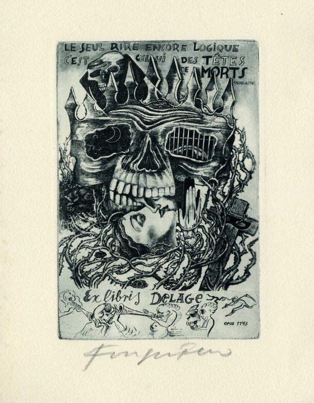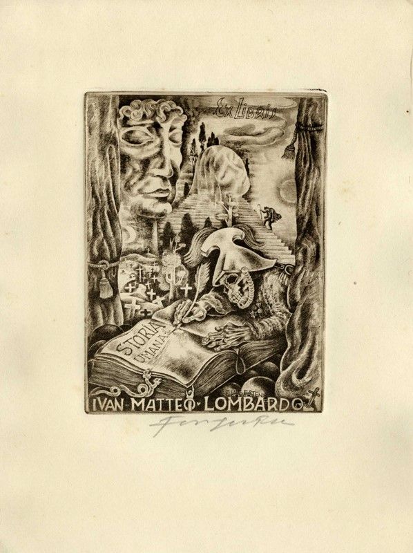 1) Le seul rire encore logique c'est celui des tetes de morts. Fotoincisione. mm 133x90. Foglio: mm 190x148. MIRABELLA-BARDAZZI-BALLERINI, 356. Firmata a matita in basso al centro. 2) Ex Libris Ivan Matteo Lombardo. 1938. Fotoincisione. mm 122x90. Foglio: mm 220x160. MIRABELLA-BARDAZZI-BALLERINI, 343. Firmata a matita in basso a destra. 3) Ex Libris Ivan e Maria Lombardo. 1938. Fotoincisione. mm 138x90. Foglio: mm 215x157. MIRABELLA-BARDAZZI-BALLERINI, 340. Firmata a matita in basso a destra.