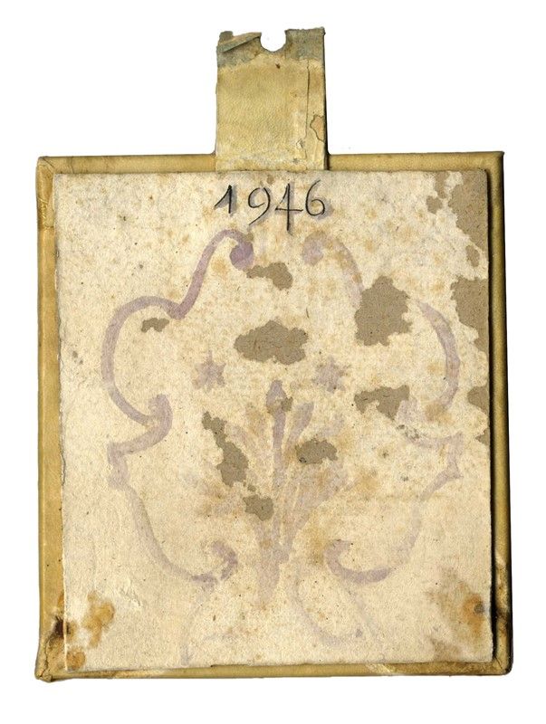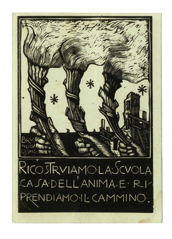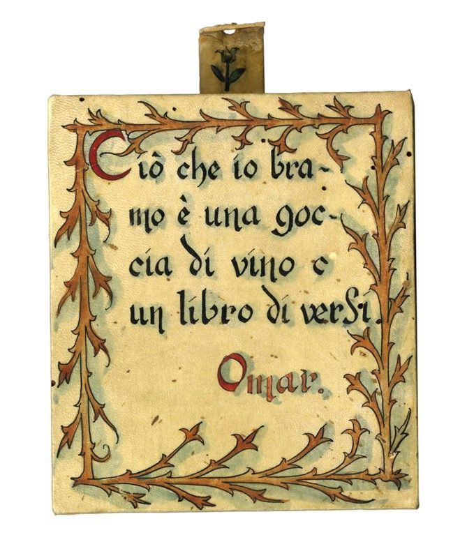 Raccolta di 3 graziosi acquerelli e penne e inchiostro di china nero su pergamena applicata a piccoli blocchi di legno. Opere realizzate per offrire le proprie condoglianze a Guido da Borsare dopo un lutto familiare. Compongono il lotto: 1) Per ben morire. Iscrizione "Pace • e • bene • a • casa • Borsara • Augurano • Bruno • Da • Osimo • e • Silvanella • ospiti" al margine superiore. 2) Ciò che io bramo è una goccia di vino e un libro di versi. Al verso: carta greve applicata con iscrizione "A • Guido • da • Borsara • per • la • fraternità • che • ci • lega • alla • divina • POESIA" con firma e data apposti poco sotto. Controfirma sul fondo dell'oggetto. 3) Un vecchio bimbo ardente di sogni folli e vani, che vive in un maniero perduto in mezzo ai cieli. Or per fratelli ha gli Angeli ed ora i Leviatani. Sdegna le turbe e impera Su i gigli e gli asfodeli. Datato al verso. Firmato sul fondo, sotto l'iscrizione "Mio • cuore • ho • trascritto • questi • tuoi • cari • versi • io". Ogni cubo presenta ricchi decori floreali sui lati e linguette per affissione sulla cima. SI AGGIUNGE: Da Osimo B., Cartolina xilografica viaggiata per Guido da Borsara. mm 150x105.