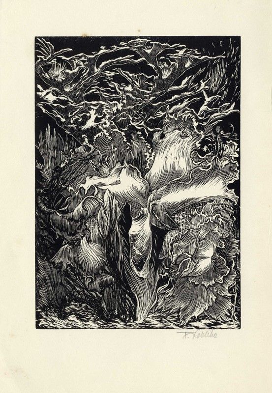 Xilografie. mm 85/160x55/110. Fogli: mm 120/220x85/150. Tutte firmate o monogrammate in lastra. Una datata in lastra. Due firmate a matita in basso a destra. Compongono il lotto uno studio decorativo floreale e tre ex libris.