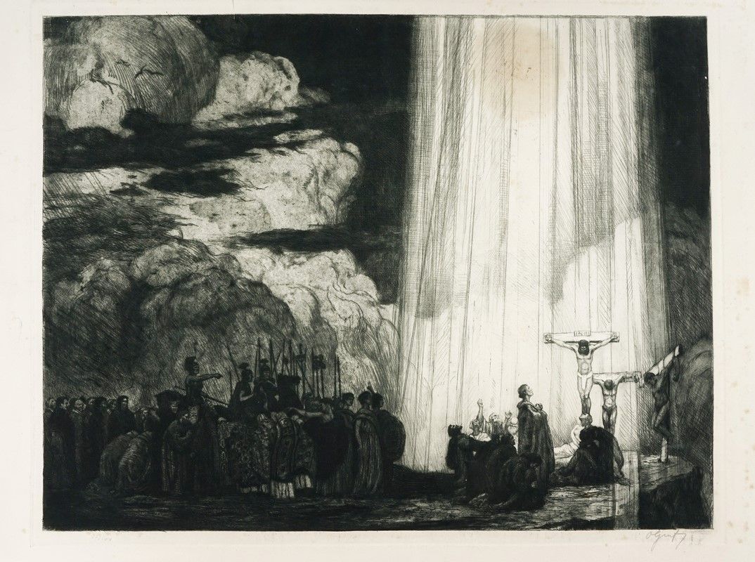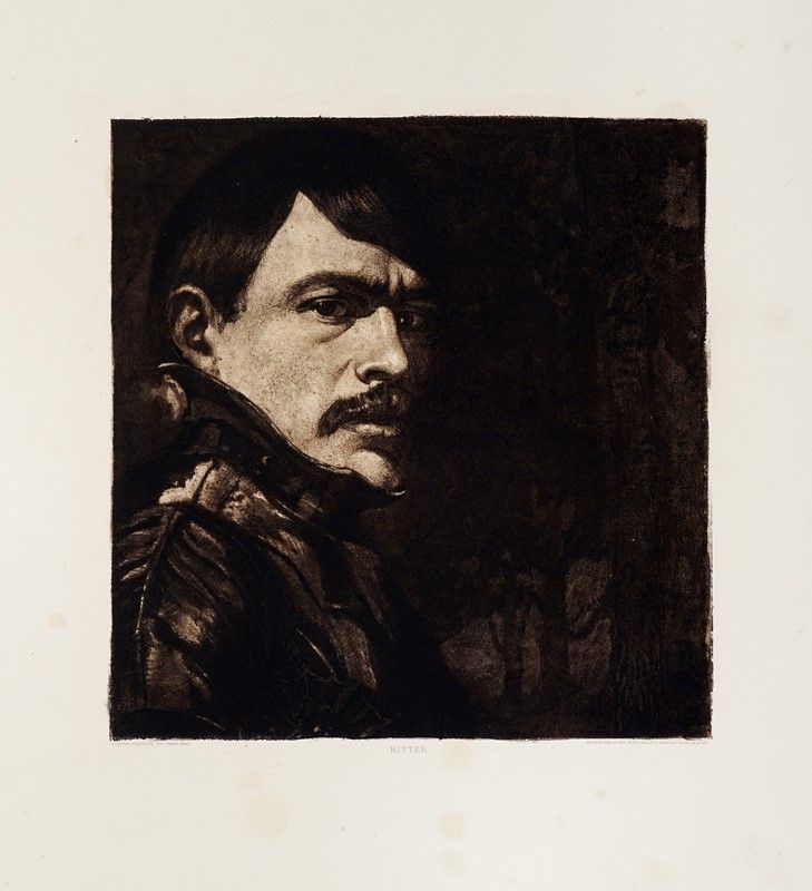 Raccolta di 5 acqueforti. mm 120/505x60/650. Fogli: mm 140/570x72/775. Tre firmate a matita in basso a destra, due numerate a matita in basso a sinistra. Compongono il lotto le incisioni: Ritter, Viterbo, Crocefissione, Kinderbildnis e un Senza titolo.