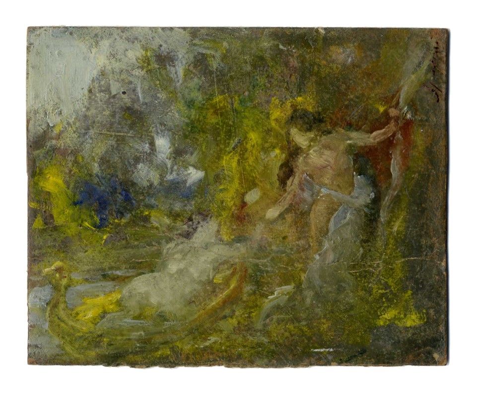 Olio su cartone. cm 11,2x13,8. Firma in alto a destra a pena e inchiostro di china bruno.
